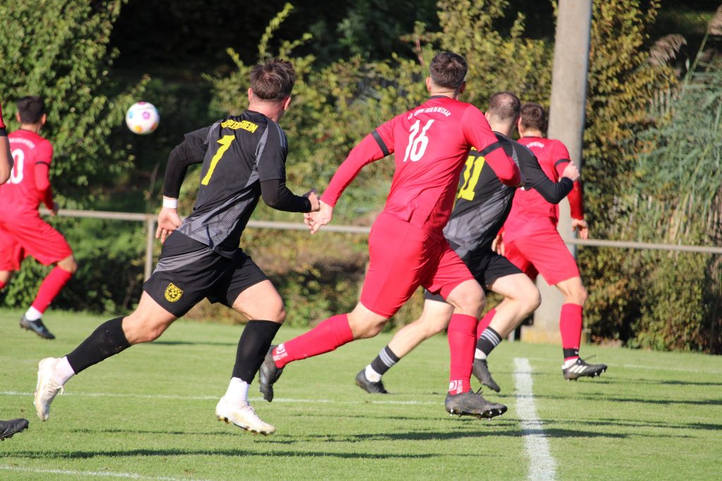 Mit dem ersten guten Spielzug, gelang dem GSV sogleich der 0:1 Führungstreffer. Robin Fausel bediente Maximilian Singer mit einem langen Pass, dieser spielte weiter zu Aaron Hachmann, der direkt auf den durchstartenden Tim Weiden passte und „Anthony“ traf ins lange Eck zum 0:1. Wenig später musste GSV Torwart Manuel Michler sein Können aufbieten und einen Schuss aus 18 Metern über die Latte lenken (14.). In der 17. Minute flankte Hachmann zu Singer, der mit seiner Direktabnahme am TSG Keeper scheiterte. Das Spiel blieb weiter ausgeglichen und Adrian Betz klärte gerade noch eine Flanke mit dem Kopf über den GSV Kasten (24.). Doch beim nächsten Angriff der Gastgeber lag der Ball im GSV Tor. Weiden verzettelte sich im Mittelfeld und den schnellen Gegenangriff schoss Kübler zum 1:1 Ausgleich direkt neben den Pfosten ins Gehäuse (30.). Mit diesem Ergebnis wurden die Seiten gewechselt. Nach der Pause agierte der GSV ein wenig besser und kam zu einigen Chancen. Fausel verpasste eine Ecke haarscharf mit dem Kopf (49.) und der eingewechselte Lucca Bendler scheiterte zweimal am TSG Keeper aus kurzer Distanz (56./64.). Auch Hachmann bekam die Kugel zweimal nicht am Torwart vorbei ins Netz (65./78.). Die TSG versuchte es immer wieder nach GSV Ballverlusten mit schnellen Kontern zum Erfolg zu kommen. Einen dieser konnte GSV Keeper Michler gerade noch stoppen, als er einen Flachschuss überragend hielt (79.). In der Schlussphase wurde es immer hektischer und es gab viele hitzige Zweikämpfe. Die letzte Chance der Partie hatten die Steinheimer, doch nach einer Flanke schoss ein TSG Spieler eine Flanke volley über das GSV Gehäuse (84.). Somit mussten die gelb/schwarzen die Punkte teilen, stehen aber immer noch an der Tabellenspitze der Kreisliga A 1.